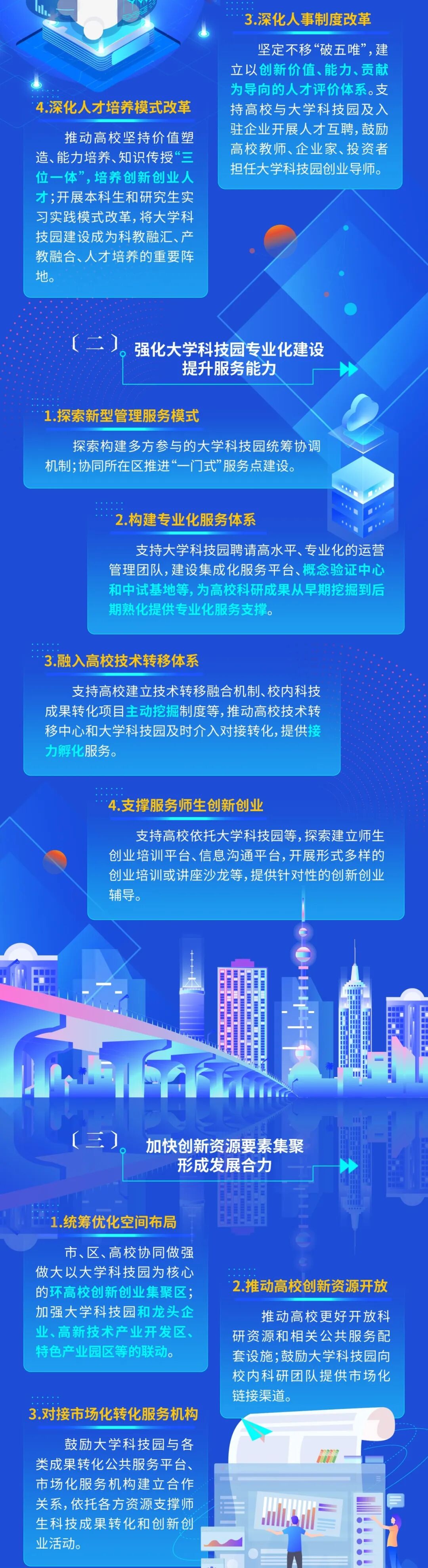 1.统筹优化空间布局。市、区、高校协同做强做大以大学科技园为核心的环高校创新创业集聚区;加强大学科技园和龙头企业、高新技术产业开发区、特色产业园区等的联动。