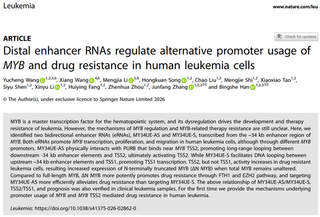 近日,平台特聘专家、上海海洋大学水产与生命学院张俊芳/韩兵社团队在白血病癌基因表观遗传调控机制及白血病耐药领域取得重要进展。相关研究成果《Distal enhancer RNAs regulate alternative promoter usage of MYB and drug resistance in human leukemia cells》发表于医学一区TOP期刊、血液学领域顶级期刊《Leukemia》(影响因子IF=13.4)。上海海洋大学为论文第一完成单位。平台特聘专家、上海海洋大学张俊芳教授和韩兵社副研究员为本文共同通讯作者,上海海洋大学水产与生命学院的王玉成博士、上海交通大学医学院儿童医学中心王翔博士和新疆医科大学基础医学院李梦佳博士为论文的共同第一作者。本研究由国家自然科学基金和上海临港新片区海洋生物医药创新平台项目联合资助。