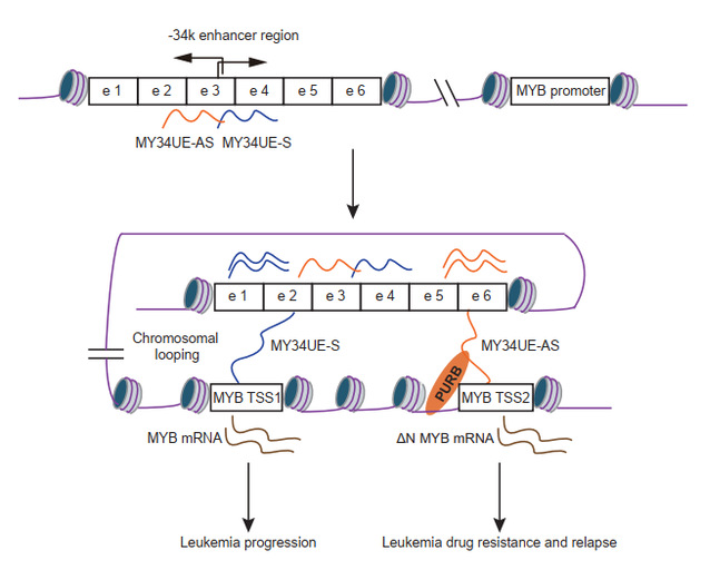 MYB 是造血系统和白血病生物学中的关键转录因子。与大家更熟悉的“基因突变”不同,这项研究把视线移到了 MYB 编码区之外的一段远端调控区域——位于 MYB 上游约 34 kb 的增强子。研究团队发现,这段增强子会产生两条方向相反的增强子 RNA(eRNA),分别命名为 MY34UE-AS 和 MY34UE-S。它们不负责制造蛋白,却能在细胞核里参与基因表达调控,影响 MYB 该如何被启动、表达。