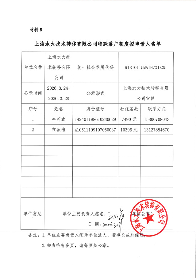 以下人员为上海水大技术转移有限公司特殊落户额度拟申请人,现予公示。公示时间自2026年3月24日至2026年3月28日,共5天。